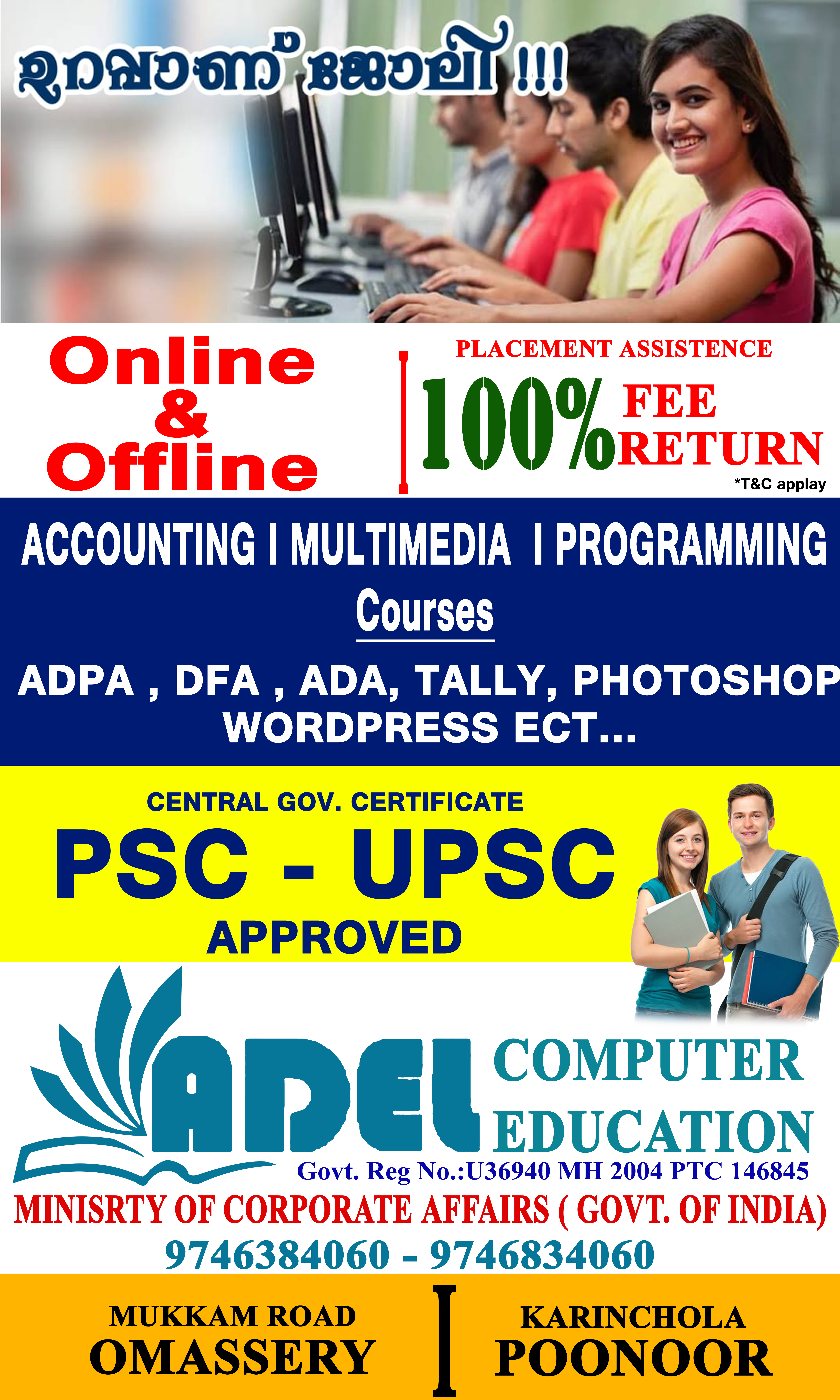 ADEL COMPUTER EDUCATION, ONLINE & OFFLINE CLASSES, CEN. GOV APPROVED CERTIFICATE, PART TIME JOB, 100% PLACEMENT ASSISTANCE, EMBASSY ATTESTED CERTIFICATE, LIFE TIME LAB SUPPORT